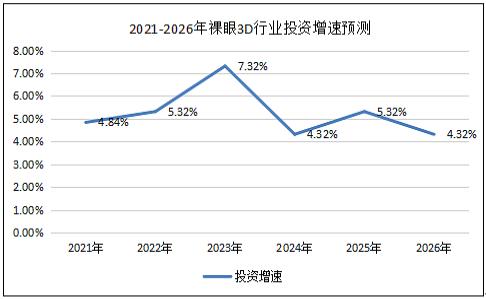 据数据显示,预测2021年裸眼3D行业投资增速为4.84%,2026年裸眼3D行业增速为4.32%,预测2021-2026年裸眼3D行业投资增速在5%左右。