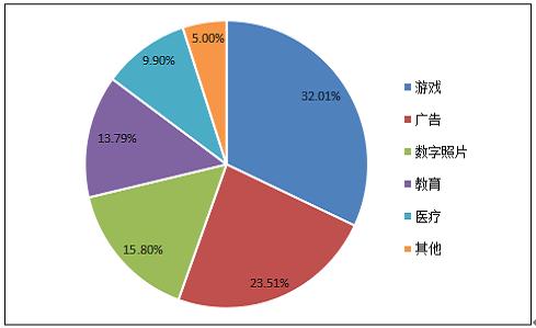 据数据显示,游戏行业占比32.01%,广告行业占比23.51%,数字照片占比15.8%,教育占比13.79%,医疗占比9.9%。