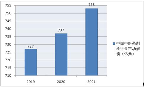 近几年,我国中医药制造市场呈不断增长的趋势。数据显示,我国中医药制造市场从2017年673亿元增至2020年737亿元,年均复合增长率为3.1%。2021年我国中医药制造市场规模达到753亿元,预计2022年我国中医药制造市场规模将逼近800亿元。