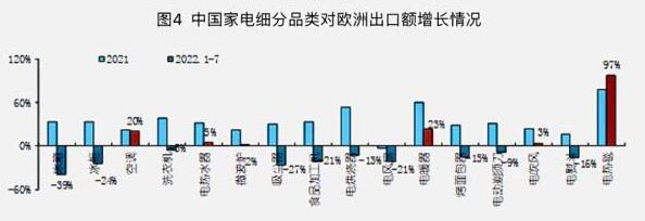 中国家用电器协会数据显示,2022年以来家电产品对欧洲出口增长的品类主要包括空调、电热水器、电暖器、电热毯、电吹风,其中电热毯以97%的增速引领其他品类。