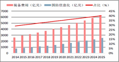 中国军工信息化建设持续加速,未来10年市场总规模有望达到1.66万亿元。2014年中国国防装备领域投入约2586亿元,其中国防信息化开支约750亿元;2015年国防装备总支出约2927亿元,其中国防信息化开支约878亿元,同比增长17%,占比为30%。2025年中国国防信息化开支将增长至2513亿元,年复合增长率11.6%,占2025年国防装备费用(6284亿元)比例达到40%。未来10年国防信息化总规模有望达到1.66万亿元。