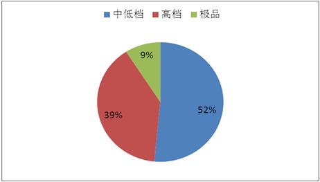 根据市场对白酒的不同档次需求,白酒包装也被按不同价格分为不同档次,其中中低档占比52%,其主要包括个人市场,高档酒市场包装占比39%,最后是极品白酒包装占比9%。