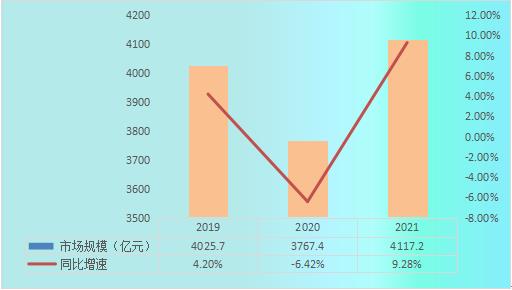 图表:2019-2021年中国货物贸易进出口总值(万亿人民币)
