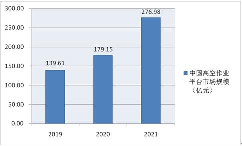 中国高空作业平台市场仍处于成长期,低成本、高效率、安全作业保障是促使高空作业平台在国内市场快速发展的三大驱动因素。根据相关数据,2019-2021年我国高空作业平台行业市场规模如下图所示: