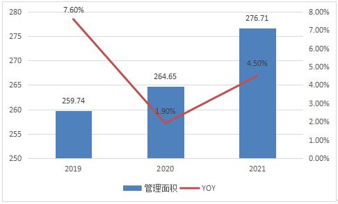 图表:2019-2021年中国物业管理面积情况(单位:亿平方米)