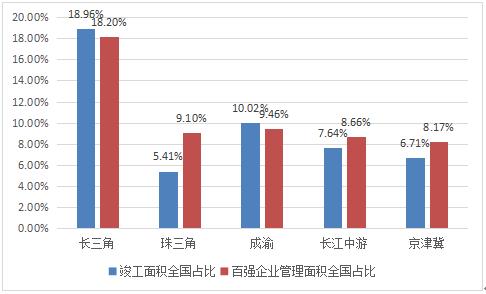根据中国指数研究院发布的《2021房地产开发投资吸引力TOP50》报告,京津冀、长三角、珠三角、长江中游以及成渝城市群将成为未来中国最具发展潜力的地区。在国家规划层面,城市群的发展进入加速期,未来中国核心城市群的空间格局已基本形成。五大城市群土地面积占国土面积的11%,而经济总量占全国经济总量的55%,是中国经济最活跃、潜力最突出的地区,其衍生出巨大的住房和物业管理需求。另根据《2021中国物业服务百强企业研究》,2021年度,物业服务百强企业超过50%的在管面积集中于五大城市群,具体分布情况如下: