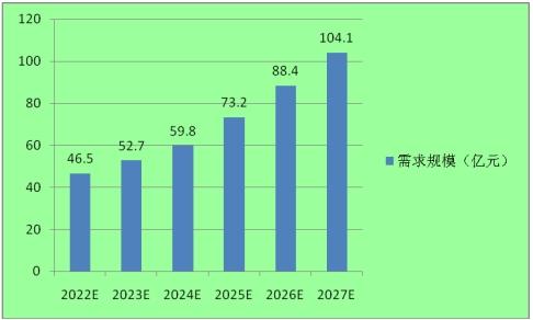 图表:2022-2027年军工线缆市场需求规模预测(亿元)