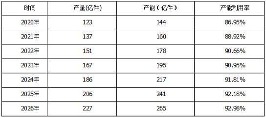 图表:2020-2026年全球针灸针产能、产量、产能利用率