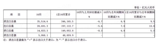 今年前10个月,中国进出口总值34.62万亿元,比去年同期增长9.5%。其中,出口19.71万亿元,增长13%;进口14.91万亿元,增长5.2%。
