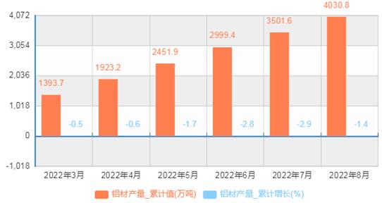 我国是世界上第二大产铜国和第一大原铝生产国,市场供应充足。2022年8月铜材累计产量为1418.4万吨,铝材产量为4030.8万吨。