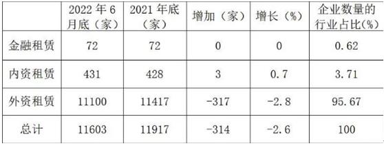 外资租赁行业进入2022年,一些外资租赁企业继续退出市场。截至6月底,全国外资企业总数约为11100家,比上年底减少317家。