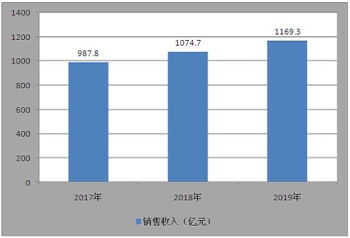 我国胶粘剂行业销售额逐年增长,从2017年的987.8亿元增长至2019年的1169.3亿元,年均复合增速达到8.8%。