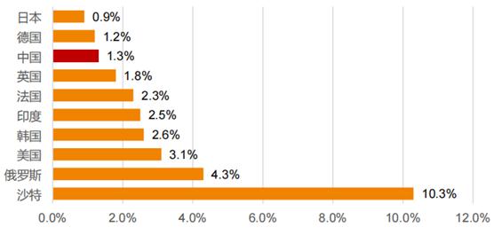 图表:2020年世界各国军费GDP占比情况