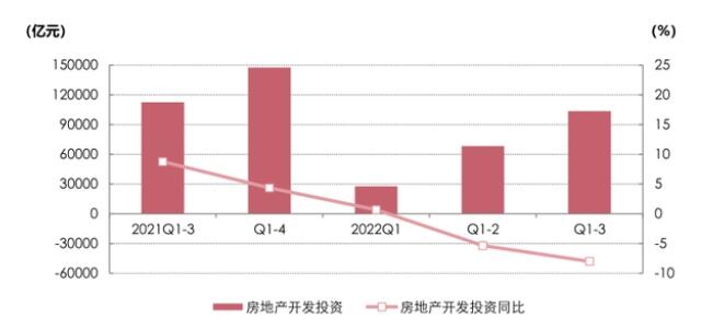 2022年前三季度,全国房地产开发投资103559亿元,同比下降8.0%,降幅较1-8月扩大0.6个百分点。其中,住宅投资78556亿元,下降7.5%。从同比走势来看,开发投资持续承压,累计增幅逐季滑落至负增长区间后继续下探。