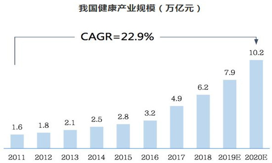 《“健康中国2030”规划纲要》提出,2020年健康产业市场规模有望达到10万亿元, 2030年将超过16万亿。