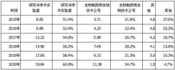 图表:全球不同应用单细胞测序规模及市场份额(单位:亿美元)