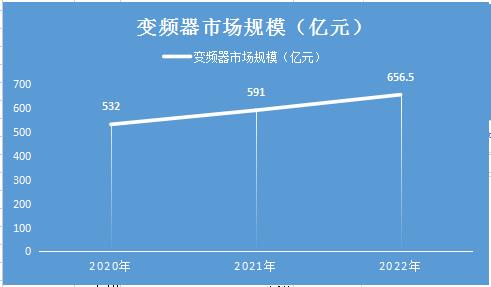 2020 年中国变频器市场规模约为 532 亿元。2021 年中国变频器市场规模为 591 亿元,同比增长 11.09%。预测到2022年我国变频器市场规模将达656亿元。