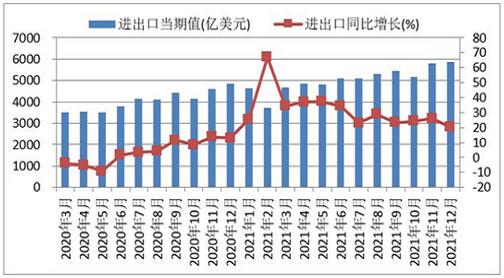 根据海关统计数据,2021年1-12月份,我国外贸进出口总额为60514.9亿美元,同比增长30%。贸易差额为6764.3亿美元。其中进口为26875.3亿美元,同比增长30.1%。按人民币计算,2021年1-12月份,进口173660.9亿元,同比增长21.5%。