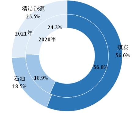 2021年,煤炭消费量占能源消费总量的56.0%,比上年下降0.9个百分点。天然气、水电、核电、风电、太阳能发电等清洁能源消费量占能源消费总量的25.5%,较上年上升1.2个百分点,比2012年提高了约11个百分点,能源消费结构向清洁低碳加快转变。