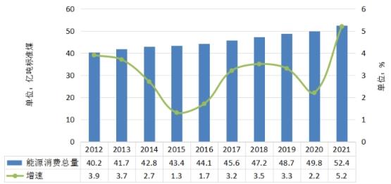 能源消费需求逐步回升,2021年,随着我国经济社会秩序持续稳定恢复,国内经济复苏和出口订单增长远超预期,能源需求也呈逐步回升态势。全年能源消费总量52.4亿吨标准煤,比上年增长5.2%,两年平均增长3.7%。煤炭消费量增长4.6%,原油消费量增长4.1%,天然气消费量增长12.5%。2021年,受能耗双控和坚决遏制“两高”项目盲目发展政策、同期基数抬升等因素影响,能源消费增速呈逐季回落态势。