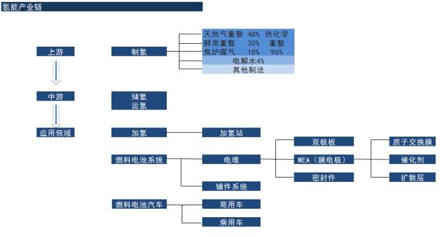 纵观日趋完善的氢能源产业链,上游是氢气的制备,主要技术方式有传统能源的热化学重整、电解水和光解水。全球来看,目前主要的制氢原料96%以上来源于传统的化学重整(48%来自天然气重整、30%来自醇类重整、18%来自焦炉煤气,4%左右来源于电解水)