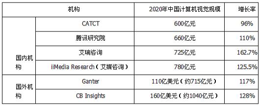 目前对于人工智能核心产业到底包含哪些、统计人工智能规模的时候是否包含AI+产业...等等问题,国内外权威研究机构尚未有统一的口径和标准,造成各大机构对我国人工智能规模到底有多大这个问题的解读差异较大,从100亿、200亿到700亿,各种说法不一而足。根据对六大权威机构的汇总,乐观估计2020年我国计算机视觉市场规模有望突破1000亿;综合保守预测2020年我国计算机视觉市场规模在700亿元左右。