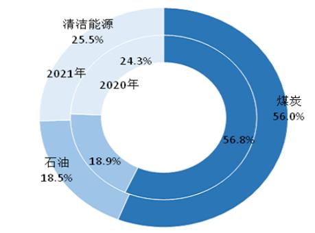2021年,煤炭消费量占能源消费总量的56.0%,比上年下降0.9个百分点。天然气、水电、核电、风电、太阳能发电等清洁能源消费量占能源消费总量的25.5%,较上年上升1.2个百分点,比2012年提高了约11个百分点,能源消费结构向清洁低碳加快转变。