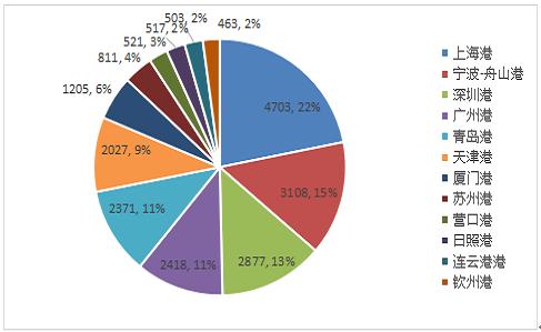 在集装箱吞吐量排名上,公开资料中12个规模以上港口集装箱吞吐量中,增速较往年普遍放缓,有部分港口出现负增长。其中,上海港达4,703万TEU,同比增长8.1%,稳居第一;宁波-舟山港2021年完成箱量3,108万TEU,同比增速8.2%,排名第二位;深圳港2021年完成箱量2,877万TEU,同比增速8.4%,排名第三。