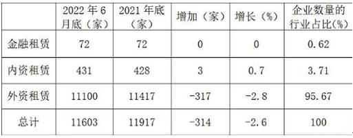 外资租赁行业进入2022年,一些外资租赁企业继续退出市场。截至6月底,全国外资企业总数约为11100家,比上年底减少317家。