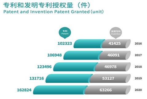 2021全年专利授权量19.9万件,比上年增长22.1%。其中,发明专利授权量7.9万件,增长25.2%。年末拥有有效发明专利40.5万件,增长20.7%;PCT国际专利申请量10358件,增长25.1%。全年共签订各类技术合同93563项,增长10.8%;技术合同成交总额7005.7亿元,增长10.9%。