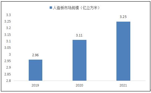 2020年,我国人造板消费量3.1101亿m3,2021年消费量为3.25亿m3。