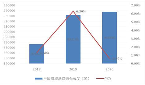 在开发与建设上,我国沿海生产用深水码头开发与建设加快,沿海港口码头长度逐年增加,2020年我国沿海港口码头长度为937856米,同比增长0.6%。
