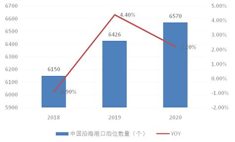 沿海港口基础设施的不断扩大和改善,也支撑了国民经济和对外贸易的快速发展。港口泊位数作为港航设施,可以反映出港口所能容纳装卸船只的数量规模,泊位数越多,装卸的船只及其货物自然增加,也是反映港口物流服务能力的基本条件,与港口经济水平有较强联系。2020年我国沿海港口拥有码头泊位6570个,同比增长2.2%。