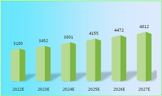 图表:2022-2027年我国工程造价咨询行业市场规模预测(亿元)