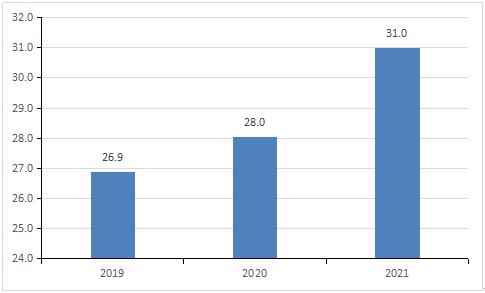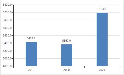 图表:2019-2021年施工行业用工人数(万人)