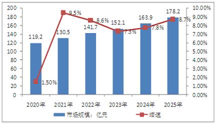 由于疫情的显著影响,预计2020年的市场规模为119.2亿元,同比增长大约1.50%。随着经济恢复增速,预计到2025年市场规模将达到178.2亿元,2020-2025年年均增速将保持在8%左右。