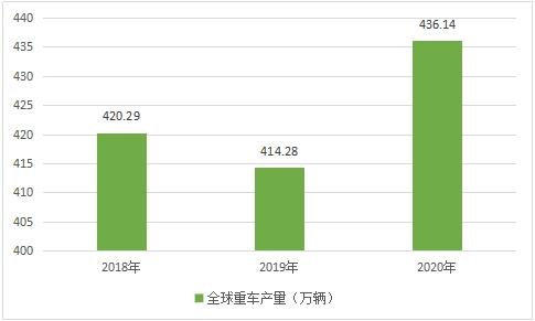 就全球重卡市场而言,随着全球经济的温和复苏以及中国重卡行业快速扩张的影响,全球重卡产量近年来呈现稳步上升的趋势,2020年在新冠疫情的冲击下仍然达到了436.14万辆,实现了近六年来的最大产量。