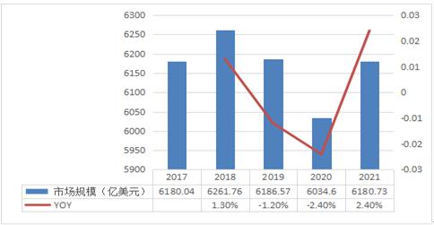 图表:2017-2021年全球肉鸡养殖行业市场规模情况