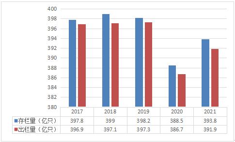 图表:2017-2021年全球肉鸡养殖存栏量与出栏量情况