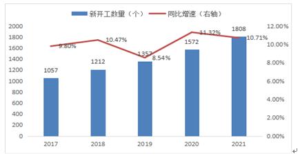 根据国家统计局统计数据显示,2017-2021年通信设备行业新开工项目数量呈现逐年增长趋势,2021年新开工数量为1808个,同比增长10.71%。