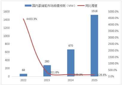 随着氢储能行业项目投资及项目完工的数量的增长。预计2025年中国氢产能的市场规模将达1518MW,同比增长126.6%。