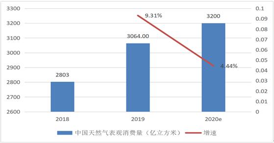 中国天然气表观消费量为增加的趋势,从2803亿立方米增加到3200亿立方米,年均复合增长率为6.85%。根据2019、2020年《中国天然气发展报告》数据,中国天然气表观消费量如下图所示: