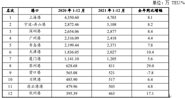 在集装箱吞吐量排名上,公开资料中12个规模以上港口集装箱吞吐量中,增速较往年普遍放缓,有部分港口出现负增长。其中,上海港达4,703万TEU,同比增长8.1%,稳居第一;宁波-舟山港2021年完成箱量3,108万TEU,同比增速8.2%,排名第二位;深圳港2021年完成箱量2,877万TEU,同比增速8.4%,排名第三。