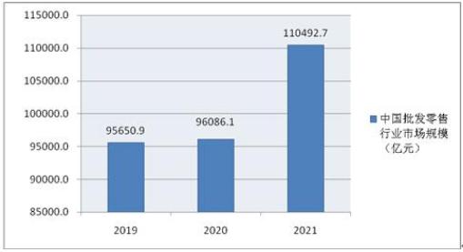 图表:2019-2021年中国批发零售行业市场规模(单位:亿元)