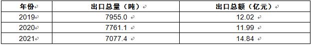 根据国家海关总署的相关数据,2019-2021年中国中药配方颗粒行业出口总量及出口总额情况如下表所示: