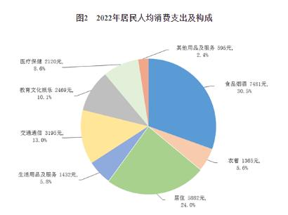 2022年,全国居民人均消费支出24538元,比上年名义增长1.8%,扣除价格因素影响,实际下降0.2%。