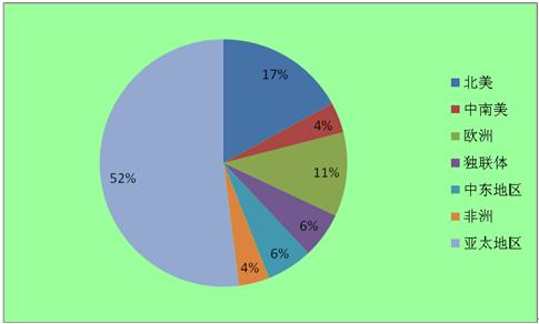 其中亚太地区碳排放量占比为52%,其次分别为北美、中南美、欧洲,碳排放量占比分别为17%、4%、11%。