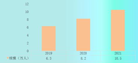 全钒液流电池行业从业人员规模由2019年到2021年由6.3万人上升到10.5万人。