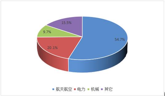 从我国高温合金应用结构来看,航空航天领域是高温合金最大的应用领域,应用占比达54.7%;其次为电力及机械领域,占比分别为20.1%和9.7%。