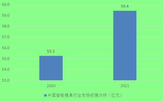 中国智能模具行业市场规模在2020年达到了55.3亿元,2021年市场规模达到了59.4亿元。